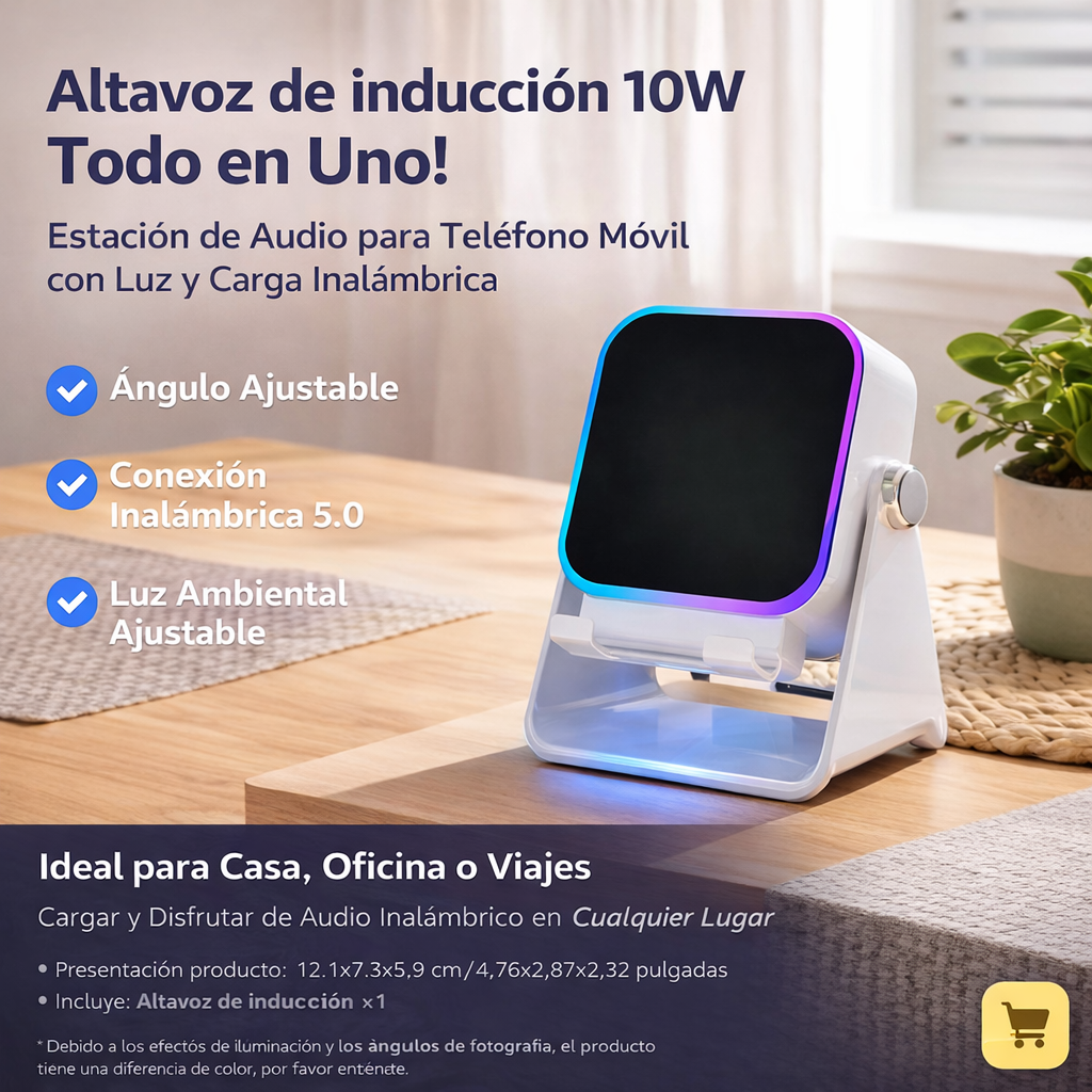 Altavoz de inducción para estación de audio de teléfono móvil con luz ambiental y soporte plegable. Combina altavoz inalámbrico, soporte para teléfono y cargador inalámbrico de 10 W, ofreciendo una experiencia de audio clara y práctica tanto en casa como en la oficina o durante viajes.